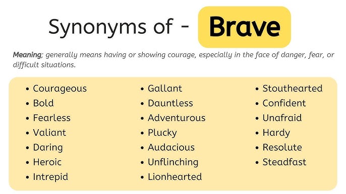 Common synonyms for brave include courageous, valiant, fearless, and daring. These words describe someone with a strong will.
